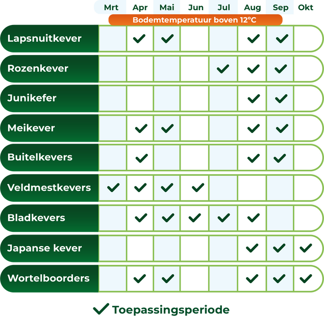 Houd rekening met de aanbevolen toepassingsmaanden per plaaginsect. Toepassingen buiten de aanbevolen behandelingsperioden zijn slechts beperkt effectief.