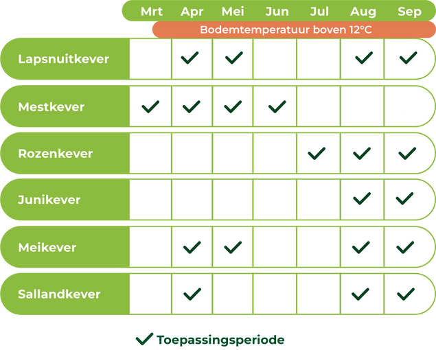 Houd rekening met de aanbevolen toepassingsmaanden per plaaginsect. Toepassingen buiten de aanbevolen behandelingsperioden zijn slechts beperkt effectief.