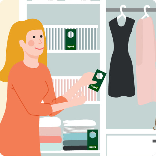 Controleer alle kledingopslagplekken en plaats minimaal één strip per plank of lade. Bij grote opslagvolumes is het aan te raden om het aantal strips per vak te verhogen.